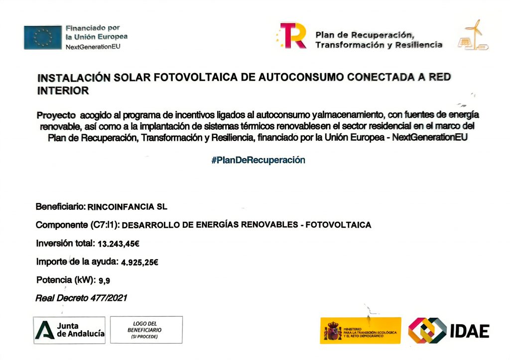 RINCOINFANCIA SL ha recibido una ayuda de la Unión Europea con cargo al Fondo NextGenerationEU, en el marco del plan de Recuperación, Transformación y Resilencia, para INSTALACIÓN SOLAR FOTOVOLTAICA DE AUTOCONSUMO CONECTADA A RED INTERIOR dentro del programa de incentivos ligados al autoconsumo y almacenamiento, con fuentes de energía renovable, así como la implementación de sistemas térmicos renovables en el sector residencial del Ministerio para la Transición Ecológica y el Reto Demográfico, gestionado por la Junta de Andalucía, a través de la Agencia Andaluza de la Energía.